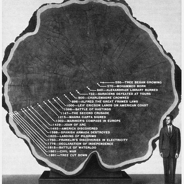 Qui sotto le date dei più importanti avvenimenti storici accaduti nel corso della vita della sequoia, prima che le cellule cancerogene ritratte nella foto qui sopra la abbattessero. Probabilmente la deforestazione dell’Amazzonia rappresenta un danno ancora maggiore per Gaia, ma l’abbattimento del Mark Twain Tree è indubbiamente una immagine simbolo da divulgare per far riflettere.